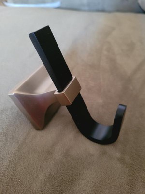 [This review was collected as part of a promotion.] The Amerock Single Prong Decorative Hook is finished in Matte Black/Golden Champagne is so beautiful. It is a nice solid piece. It attached very easily to the wall. The instructions and template were a breeze. The hook is very sturdy to hold your item. I highly recommend it to show off whatever you use it for.