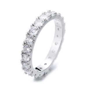 The ring features a classic eternity band design, with small crystals encircling the entire circumference of the ring. The silvertone metal provides a sleek and elegant backdrop for the sparkling crystals, creating a stunning contrast that is sure to dazzle in any light. The band is thin and lightweight, making it comfortable for all-day wear and easy to stack with other rings.