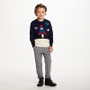 Blast off into cozy comfort! This space-themed knit pullover brings intergalactic fun to everyday outfits with a bold rocket ship soaring past planets and stars. The rich navy background makes the vibrant red, blue, and yellow details pop, while the soft knit keeps kids warm on all their adventures—whether in the classroom or on a cosmic mission.