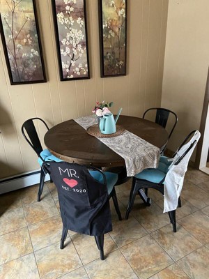 We searched and searched for the perfect smaller round table for our limited dining space until we found this amazing piece. It's sturdy, and looks just like the pictures. We love the wood / metal combination. One person relatively easy assembly always a plus as well! (thank you hubby!) We are very please with our purchase at an affordable price! Arrived faster than estimated delivery too.