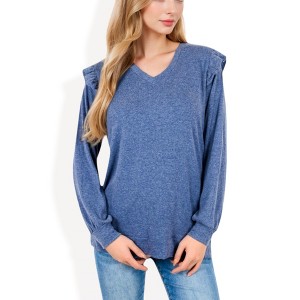 This long sleeve V-neck top features charming ruffled shoulder details for a touch of femininity. Made from soft, breathable fabric, it ensures all-day comfort and easy movement. The classic V-neckline offers a flattering silhouette, perfect for layering or wearing alone. Ideal for casual outings or office wear, this top pairs effortlessly with jeans, skirts, or tailored pants.