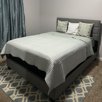 Silver nailhead trim is more noticeable than in the picture. Easy to assemble. The directions are clear and simple. You need a power drill for the footboard legs and 4 slats. You need a box spring like they say in the description. From slats to bottom of headboard it is 15in-16in. Feels sturdy.