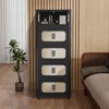 - The storage bins features unique rattan design doors,adding a natural,textured aesthetic. This design element not only enhances visual appeal but also brings a touch of bohemian or coastal charm,making it suitable for various decor styles.