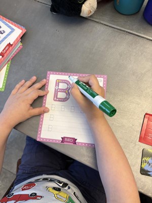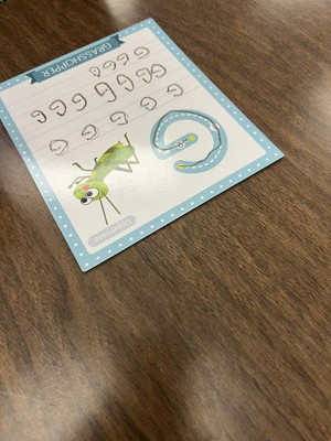 These tracing cards are cute, engaging and durable. Each of the letter cards have capitalized letters on one side and lowercase on the flip side. They each have different character drawings that correspond to the letter the child is to be working on.