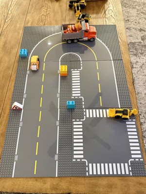 These baseplates thrilled and delighted my son who is VERY much into trucks, cars, and all things construction. They are compatible with other brick toys. It was a bit tricky to get Duplos to stay, but we eventually got it. The only down side is the plates tend to slide apart. There isn’t anything to keep them together unless you use a brick on top, which is completely doable.