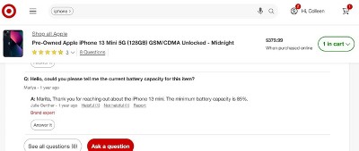 A: Marita, Thank you for reaching out about the iPhone 13 mini. The minimum battery capacity is 85%.
