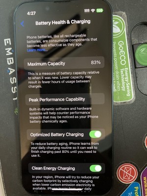 Q: What is the battery maximum capacity percentage displayed in the settings for this phone?