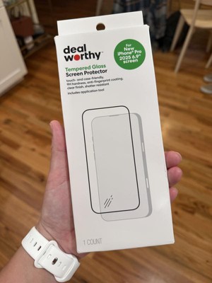 The Apple iPhone 17 Pro Max Screen Protector - dealworthy™ Clear is designed for the Apple iPhone 17 Pro Max, offering shatter-resistant tempered glass protection. It features an anti-fingerprint coating to maintain screen clarity and cleanliness. With precise dimensions, it ensures a snug fit, measuring 6 inches in length, 3 inches in width, and 0.01 inches in thickness. This single-pack protector provides essential defense against scratches and impacts, preserving the device's display quality.