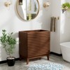 - 𝐌𝐢𝐝-𝐂𝐞𝐧𝐭𝐮𝐫𝐲 𝐁𝐚𝐭𝐡𝐫𝐨𝐨𝐦 𝐕𝐚𝐧𝐢𝐭𝐲: Bring mid-century and modern style to your bathroom with the clean lines and flared profile of this 24" bathroom vanity. The integrated walnut grain finish is both durable and beautiful, adding elegance and fashion to your bathroom