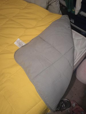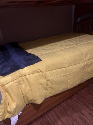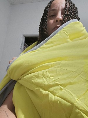 [This review was collected as part of a promotion.] I was very pleased with this comforter! It has 2 sides yellow and grey and it’s very comfortable. It fits my queen bed perfectly and the quality is great! I have washed it a few times already and haven’t noticed any rips or threads coming out.