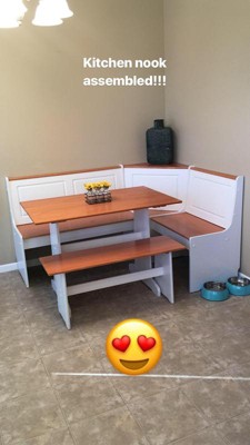 Overall, beautiful nook set! It was impossible to put together and broke while assembling. However, we were able to to still put it together and it is a winner. It just moves too easily at times with kids. Otherwise, great purchase and color!