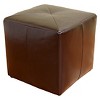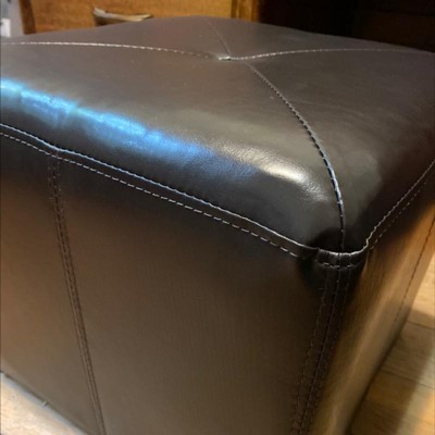 Small, versatile, affordable – this bonded leather cube ottoman in dark brown can be placed anywhere and used for just about anything. From a foot rest to additional seating, from a coffee table arrangement to an accent - the rich look of the shiny leather will enhance your interior. The ottoman is lightly padded with foam and includes small round black plastic feet. This item will arrive fully assembled.