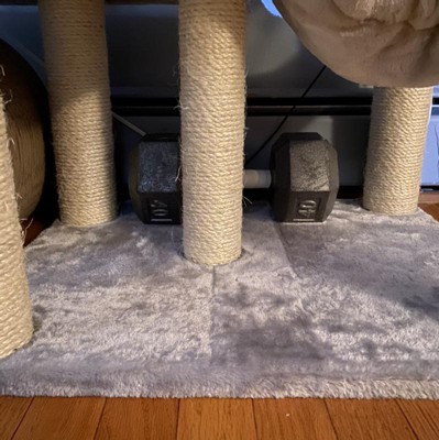 This cat tree is pretty awesome! I give it four stars because the design is a little strange at the top. Very difficult for my cats to get on the very top. There’s not much room to prepare for a jump on or off the very top (didn’t realize this until actually getting the tree and putting it together). While it’s quite sturdy, the very bottom board is not even so, it’s slightly wobbly but it’s a very slight wobble. So, I used a weight to keep it from tipping, incase multiple cats jump up at a time (had a cat tree tip on my previous cats). If I could mount it to the wall, I would but I don’t have the supplies for that at the moment so, I used a weight. I have an Orange Tabby, a Tortoiseshell, and a Siamese. The Tabby and Tortie are not too fond of the tree yet but my Siamese is in love! She’s having a ball on it. Other than that, the design is super cute and the colors are neutral and match my house. I also love that it’s pretty esthetically pleasing to the eye, for a cat tree, and can fit in smaller places because it’s slim and tall.