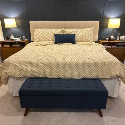 Stunning! Mid-century type design. Fabric has beautiful and subtle blending of blue hues. Storage option is fantastic. Tufting looks sharp.