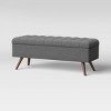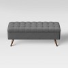 Stunning! Mid-century type design. Fabric has beautiful and subtle blending of blue hues. Storage option is fantastic. Tufting looks sharp.