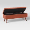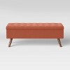 Give your living space style as well as function with this Arthur Tufted Storage Bench from Threshold™. This upholstered accent piece features a wood-like frame held by four elegant, slanted legs, adding a sense of depth, dimension and texture to your space, while an interior storage unit offers ample space to keep your home organized. The tufted bench can act as both a spot to sit and a decorative accent piece. Perfect for storing extra blankets, board games and more, this cushioned bench easily brings a modern accent to your entryway, living room and more.