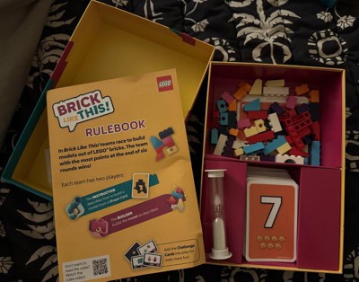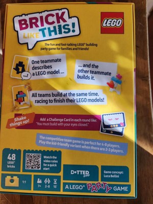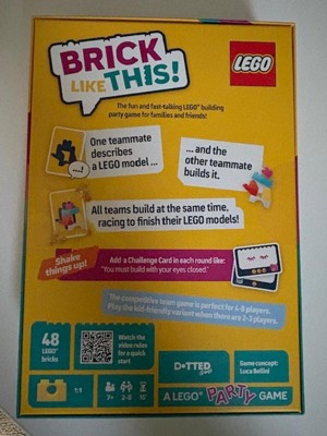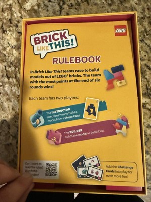My kids love playing with Legos, so this Brick this game is fun for them to play and also fun. The game has cards that you draw and build things with your eyes closed for instance. We have a lot of laughs playin this game and also There is a QR code to scan for a video on how to watch the rules which my son loved. One team member descibes what to build and the other tries to build it