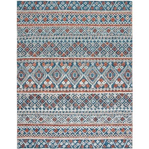 Transform your living space with the eclectic charm of our hand-tufted Bohemian-style area rug. Capturing the essence of creativity and free spirit, this rug features a mesmerizing pattern of geometric shapes and cultural-inspired motifs, presented in an eye-catching palette of blue and orange hues.
