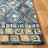 The rug features a mesmerizing pattern that captures the eye and the imagination, displaying an intricate series of geometric designs in a harmonious blue and gold color palette. The varying shades of blue create a serene backdrop, while the gold accents offer a subtle shimmer, providing a luxurious and inviting atmosphere.