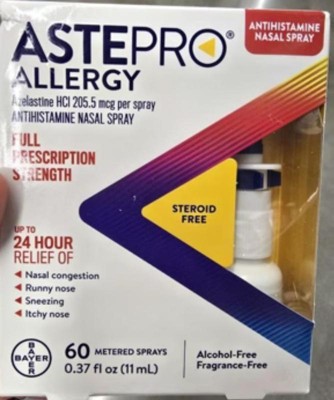 Astepro(R) Allergy is the first and only 24 hour, steroid-free nasal spray for allergy relief. While other allergy sprays may take hours to start working on the first day, Astepro, full-prescription strength allergy medicine, starts working in 30 minutes . This steroid-free allergy spray provides long-lasting allergy relief of indoor and outdoor nasal allergy symptoms; nasal congestion, runny nose, sneezing, and itchy nose for up to 24 hours. Astepro allergy has flexible dosing, so it can be used once or twice daily for allergy relief. One spray contains 205.5 mcg of azelastine HCl.