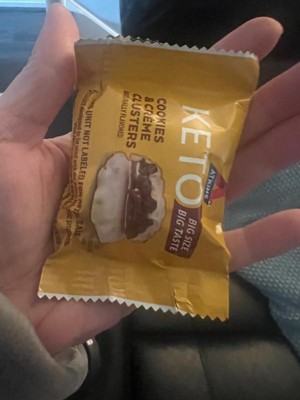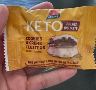 [This review was collected as part of a promotion.] I received a free sample size of an individually wrapped Atkins Keto big size big taste Cookies & Crème Clusters. It has a smooth cookies & crème outer shell & a soft gooey chocolate & caramel inside. It has the perfect texture crispy & delicious taste. It tasted better than I had expected. Overall great quality & taste.