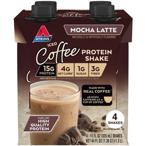 - AT HOME OR ON-THE-GO. Atkins Mocha Latte Iced Coffee Protein Shakes. Enjoy delicious shakes that fit right into your Busy schedule, with 15g of protein, 4g of net carbs, and 1g of sugar per serving*. This is Today’s Atkins™.
