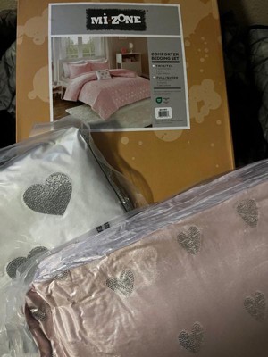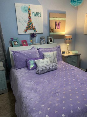 [This review was collected as part of a promotion.] The Mi Xone Rosalie comforter set is so cute and comfy!! It is a full queen size and is a purple comforter with silver metallic hearts. It is a thick comforter so it keeps you warm, and is just so darn cute for a little girl’s room! The decorative pillow with Pom poms is such a nice touch to complete the set.