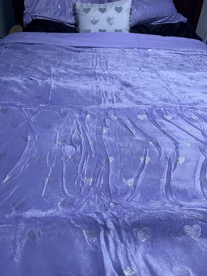 [This review was collected as part of a promotion.] I am in love with the super soft design, the quality of the fabric, very comfortable to the touch, the size fits perfectly on the mattress and with some very pretty details that give it the perfect touch, the color is lilac and the hearts are silver, the quilt came with two pillowcases and a decorative cushion.