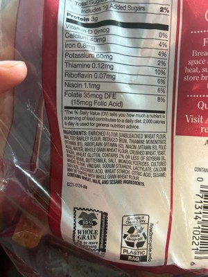 enriched flour [unbleached wheat flour, malted barley flour, reduced iron, thiamine mononitrate (vitamin b1), riboflavin (vitamin b2), niacin (vitamin b3), folic acid], water, whole grain wheat flour, crushed wheat, yeast, sugar, wheat gluten, soybean oil, wheat bran, buttermilk, cultured wheat flour, salt, monoglycerides, vinegar, sodium stearoyl lactylate, potassium chloride, calcium sulfate, wheat starch, citric acid, ascorbic acid, sesame; may be topped with flour.