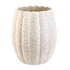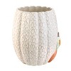 The Avanti Grateful Patch Wastebasket features two stacked textured pumpkins in light orange and aqua on the front of the faux carved wood, off-white with brown accent base. Made of durable, hand-painted resin for easy care and long life. Measures W 8.5" x L 9" x H 10". Coordinating towels, rug, shower curtain, bath accessories, table linens and bedding also available.