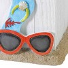 The Avanti Beach Mode Collection Tissue Box Cover features "Take a Deep Breath" on an off-white shiplap ground. It sits on a sand base. Blue flip-flops, red sunglasses and shells decorate the piece. Made of durable, hand-painted resin for easy care and long life. Measures W 6.75" x L 6.75" x H 5.75". Coordinating towels, rug, shower curtain, and bath accessories also available.