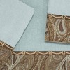 The Avanti Bradford Mineral 3-Piece Decorative Embellished Towel Set is bordered with a rich brown, blue and gold jacquard paisley fabric finished with an elegant gold and brown trim. The velour towel is 100% cotton. Includes 1 ea of bath (27" x 50"), hand (16" x 30") and fingertip (11" x 18") towel. The velour finish provides a smooth, velvety feel with a subtle sheen.