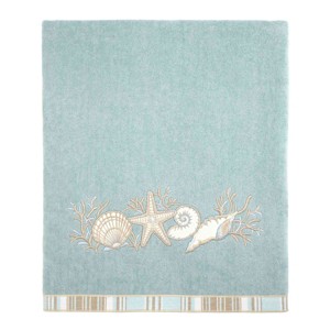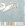 The Avanti Sand Shells Mineral Decorative Bath Towel features embroidered shells, starfish and coral in shades of blue, beige and ivory. The towel is finished with a coordinating striped fabric border. Towel is 27" x 50" 100% cotton mineral velour. The velour finish provides a smooth, velvety feel with a subtle sheen. Other sizes, colors available.