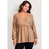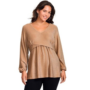 This top features a soft shimmer finish that catches the light for a subtle, eye-catching glow. It has a V-neckline and a gathered empire waist seam that provides a flattering, feminine silhouette. The long sleeves are finished with elastic cuffs, adding a touch of volume and ease to the overall look.