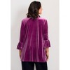 This top is features a plush velour fabric, giving it a soft texture and elegant drape. It features a split neckline with subtle ruching at the shoulders for added dimension. Flounced cuffs on the long sleeves add a feminine and stylish finishing touch.