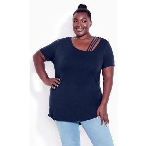 A trendy must-have in any wardrobe, the V Cut Out Top elevates your day-to-day look. The asymmetrical neckline with triple strap detail lends this a bold look, along with soft stretch fabrication for effortless comfort. Key Features Include:- Asymmetrical neckline with triple strap detail- Short sleeves- Pull-over style- Relaxed fit- Soft stretch fabrication- Curved hip-length hemlineTeam this top with a midi skirt and beige flats. Outer: 95% Viscose, 5% Elastane. Lining: 100% Polyester. Fabric has stretch.MACHINE WASH COLD. NON-CHLORINE BLEACH. DO NOT TUMBLE DRY. DO NOT IRON.Imported.