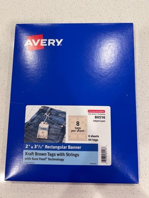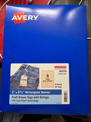 Add a rustic touch to gift tags, favor tags and more with Avery 80516 Kraft Brown 2" x 3.5" Banner Tags with Strings. Made with a kraft brown paper material that's smooth to the touch, Avery kraft brown cardstock adds a natural and handcrafted look to any project. This charming kraft brown material is made with an 80lb / 216gsm cardstock that is perfect for adding a little homespun flair to bookmark tags, sales tags, instruction tags, hang tags and more. Sure Feed technology reduces jams and smudges by creating a more reliable feed through your printer. Microperforations along the edges of each card make it easy to fold and tear away each card while creating a smoother edge without any jagged and rough perforations. Please Note: For best results, feed one sheet at a time and set your printer options for the cardstock quality setting.