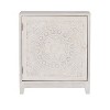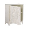 With a modern rustic look, this cabinet is the perfect décor choice for any room in your home. The smokey white antiqued finish highlights the resin medallion front of the cabinet door. The piece opens to one fixed interior shelf for storage and organization. The round wooden knob and short, straight legs bring finishing touches to this sophisticated piece.