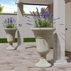 AZL1 Life Concept 2-pack of 23.62-inch tall petal/trophy-style planters combines functionality and aesthetics, featuring a two-piece twist structure to prevent root rot and dual water storage/drainage for optimal plant growth. Made of weather-resistant HDPE plastic, they suit tall outdoor plants and indoor flowers alike, with a petal-like design adding elegant charm to any space—ideal for both gardening needs and home decor enhancement.