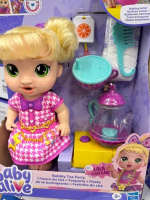 LaLa GooGoo is ready for a magical tea party with the Baby Alive Bubbly Tea Party baby doll set! Fill the tea kettle with water and place it on the toy stovetop to imagine getting ready to make tea. Then, press the button to make the water bubble! Kids can host their own imaginary tea party with included teacup and teabag accessories. After LaLa drinks her pretend tea, it's time for a diaper change! Comes with 1 Baby Alive diaper (refills sold separately). LaLa has soft hair and removable doll clothes. Imagine tea party fun with Baby Alive playsets and dolls for girls and boys! Baby Alive and all related properties are trademarks of Hasbro.