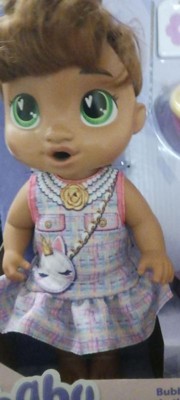 Sophia Sparkle is ready for a magical tea party with the Baby Alive Bubbly Tea Party baby doll set! Fill the tea kettle with water and place it on the toy stovetop to imagine getting ready to make tea. Then, press the button to make the water bubble! Kids can host their own imaginary tea party with included teacup and teabag accessories. After Sophia drinks her pretend tea, it's time for a diaper change! Comes with 1 Baby Alive diaper (refills sold separately). Sophia has soft hair and removable unicorn -themed doll clothes. Imagine tea party fun with Baby Alive playsets and dolls for girls and boys! Baby Alive and all related properties are trademarks of Hasbro.