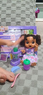 Includes doll, blender, spoon, bottle, comb, 2 powdered doll smoothie packets, and 2 diapers.