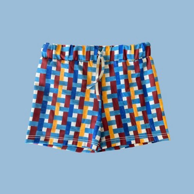 The material is shiny. It’s very cute colors. Babies are able to be stylish and adorable at the same time. It fit true to size. It latest for a day of beach fun. It did not stretch out too much with washing.