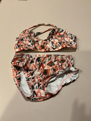 I have a 14 month old daughter. It was hard to get this cute top on her as she squirmed around. Once I got it on, it looked cute but the top was a little big. I thought the ruffles on the top were a bit much for a 14 month old. The bottom fit well. This bikini washed well and is made out of nice material.