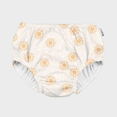 Very cute swim suit with a fun playful print! Somewhat unique colors and print for an infant girl swim suit but unexpected is fun! My baby girl is 9 months old yesterday, average height and weight and I tried the suit on without a diaper. I would say it fit more snug than I was expecting without a diaper but swim diapers are pretty minimal in terms of bulk. A cloth swim diaper would really be some work to get under the swim suit.