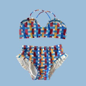 This is a cute pattern and an interesting bikini design with the crinkles and the laced edge, but I would never expect this to be for a toddler or an infant, which is exactly what it is. This thing is so small that the age of the child wearing it, I feel should definitely just be wearing a shirt and a swim diaper, not a bikini. The top is basically a bra, and no toddler should be wearing that, in my opinion. But even if I wanted my child to wear something like this, it's so incredibly small it would better fit an INFANT than a toddler. There's no way I'd be able to wiggle this over the top of my toddler. It's too small and tight.