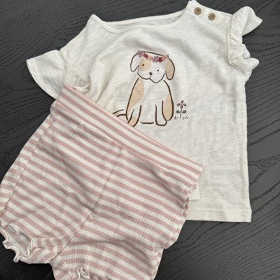 Bring a touch of playfulness to your baby's wardrobe with this 2-Piece Dog Floral T-Shirt Shirt & Bike Shorts Set from Cloud Island™. This two-piece outfit set includes a flutter short-sleeve tee with a dog wearing a floral headband graphic on the front and a shoulder snap closure, plus a pair of pull-on ribbed shorts with a striped pattern. Crafted from a blend of cotton, recycled cotton, and modal fabric, the outfit set provides your little one with all-day comfortable wear, and the shorts feature an elastic waistband for a snug fit.