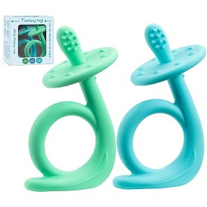 If your little one struggles with holding or maneuvering teethers, these are the perfect solution! My nearly four-month-old, who's just starting to teethe, had difficulty with other teethers until we tried these. On his first attempt, he effortlessly held and brought it to his mouth independently! The round handle is incredibly easy for him to grasp, with a smooth texture suitable for teething. The teether's end features rounded nubs for gum massage, while the shield prevents him from inserting it too far into his mouth, eliminating any gagging or choking concerns. Even my toddler loves this set—it's durable and withstands his chewing. Cleaning is a breeze with hot, soapy water, thanks to their one-piece silicone design that prevents water from getting trapped. They're not sticky, so they don't attract much lint either. I appreciate that it comes in a convenient set of two, with adorable gift packaging perfect for gifting or adding to a baby registry. I can't recommend this item enough!