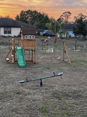 After the hurricane wiped out our other swing set, we decided on this one for our soon to be 6 year old! She loves it! Little house with a door, swings, side, monkey bars, picnic table… we love it!