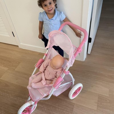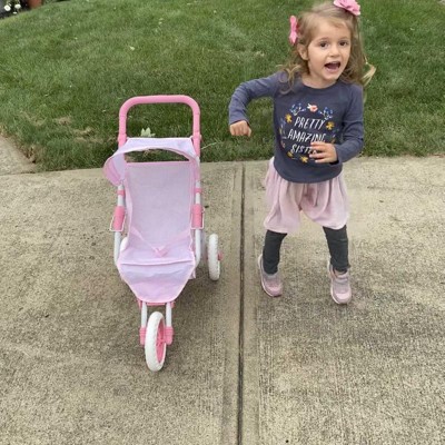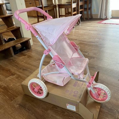 I purchased this jogging stroller for my three year old daughter as an upcoming Christmas present. I put it together yesterday so it’s ready Christmas morning with her new baby doll inside. Overall it’s ok, I have two issues with it. First, the material is very thin, we’ll see how it holds up once she gets it. Second, the shade does not stay up, it comes back down, so I guess it will have to always stay up. Things that I liked about it are, the size of it, it’s much bigger than a doll umbrella stroller. Also, the storage basket. I know she will like it but I’m just hoping that the material doesn’t rip right away. So in conclusion, not terrible but not great either.